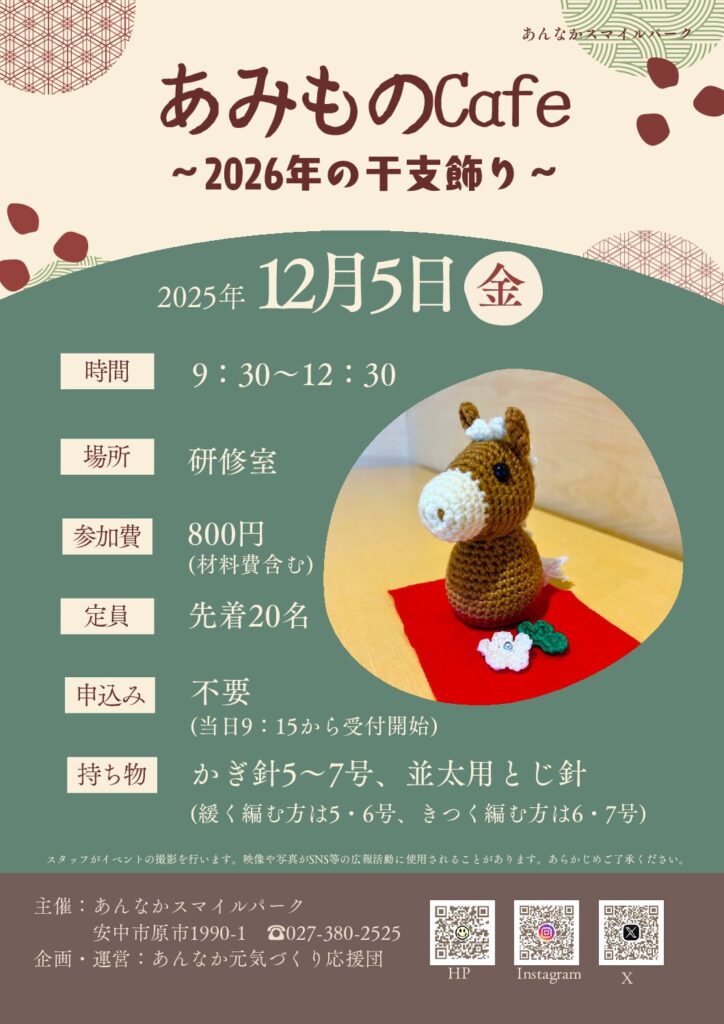 パークのイベント あみものCafe~2026年の干支飾り~ 2025.10.27 もうこんな時期なんですね…あっという間に2026年が近づいてきました。今回のあみものCafeは2026年の干支である『午(うま)』をつくります🐎手作りのあみぐるみで、新年を迎えましょう🎍かぎ針はご自身の編み方に合わせて、5~7号をお持ちください。 あみものCafe~2026年の干支飾り~ダウンロード Tweet Share Hatena Pocket RSS feedly Pin it この記事のタイトルとURLをコピーする 12月イベント『クリスマスファミリーコンサート』 前の記事 フェイクスイーツを作ろう~縁起の良い和菓子~ 次の記事