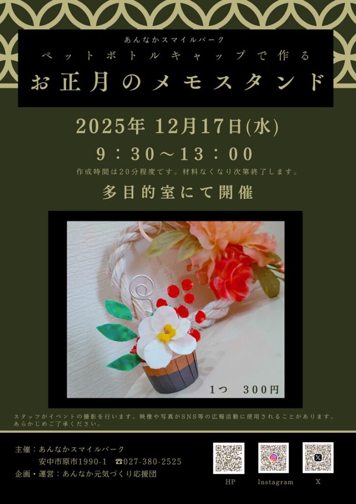 パークのイベント お正月のメモスタンド 2025.11.09 あっというまに寒くなってきました。みなさん、風邪はひいていませんか?ペットボトルキャップを利用してお正月のメモスタンドを作るワークショップを開催します。今年もあとわずか…一緒にハンドメイドを楽しみましょう☆ お正月のメモスタンドダウンロード Tweet Share Hatena Pocket RSS feedly Pin it この記事のタイトルとURLをコピーする フェイクスイーツを作ろう~縁起の良い和菓子~ 前の記事