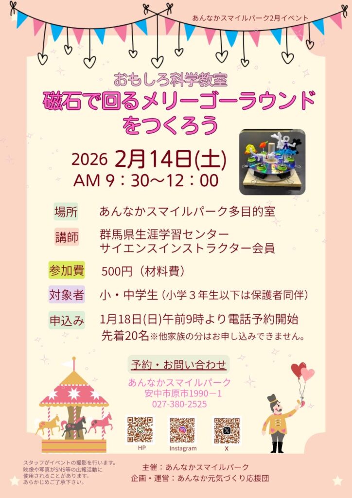 パークのイベント おもしろ科学教室~磁石でまわるメリーゴーラウンドを作ろう~ 2025.12.15 スマイルパーク2月イベントは…大人気!おもしろ科学教室です✨磁石の不思議を学びながら、クルクル回るメリーゴーラウンドを手作りしてみよう!ご参加お待ちしております。対象:小・中学生(小学3年生以下は保護者同伴)定員:先着20名参加費:500円参加にはご予約が必要となります。申込み:1月18日(日)午前9時から電話予約開始公平を期すため、他家族分のお申込みはできません。 2月イベント おもしろ科学教室~磁石で回るメリーゴーラウンドを作ろう~ダウンロード Tweet Share Hatena Pocket RSS feedly Pin it この記事のタイトルとURLをコピーする 11月うまれのおたんじょうび会 前の記事 太極拳入門 次の記事