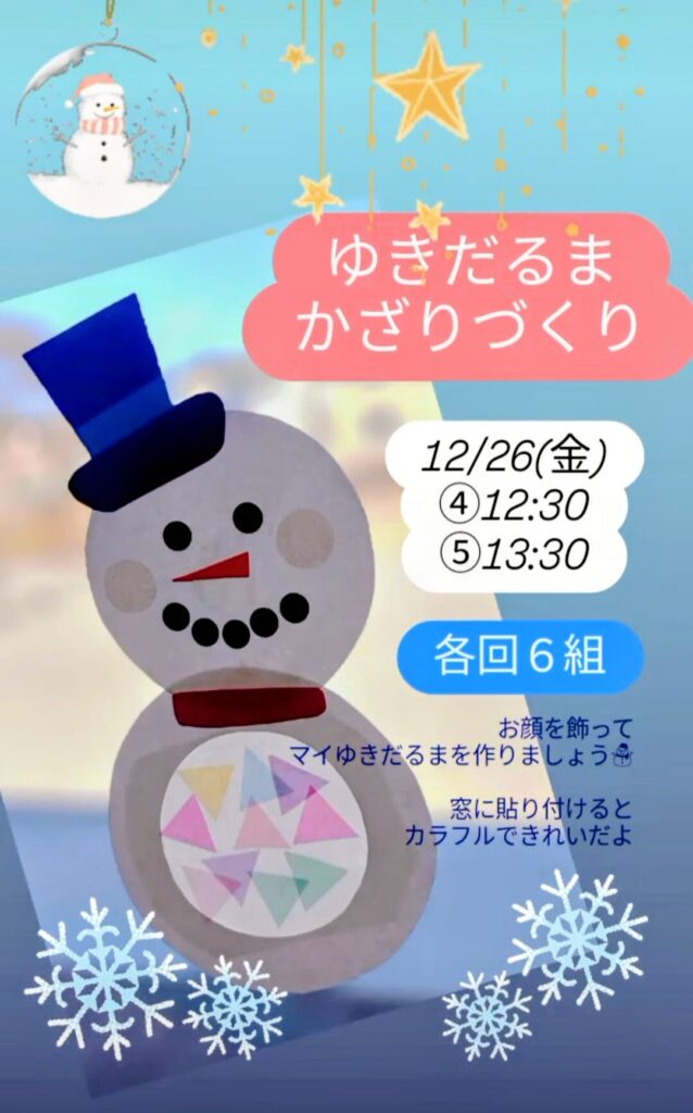 ニコニコ 室内制作 【ゆきだるま飾りづくり】 2025.12.24 お顔にシールを貼ったり、お腹にセロファンをつけたりして、マイゆきだるまを作りましょう♡窓に飾るとカラフルできれいですよ。プレイルーム内で作れます。お時間ご確認のうえお越しください。 Tweet Share Hatena Pocket RSS feedly Pin it この記事のタイトルとURLをコピーする 12月うまれのおたんじょうび会 前の記事