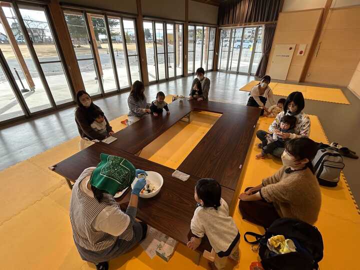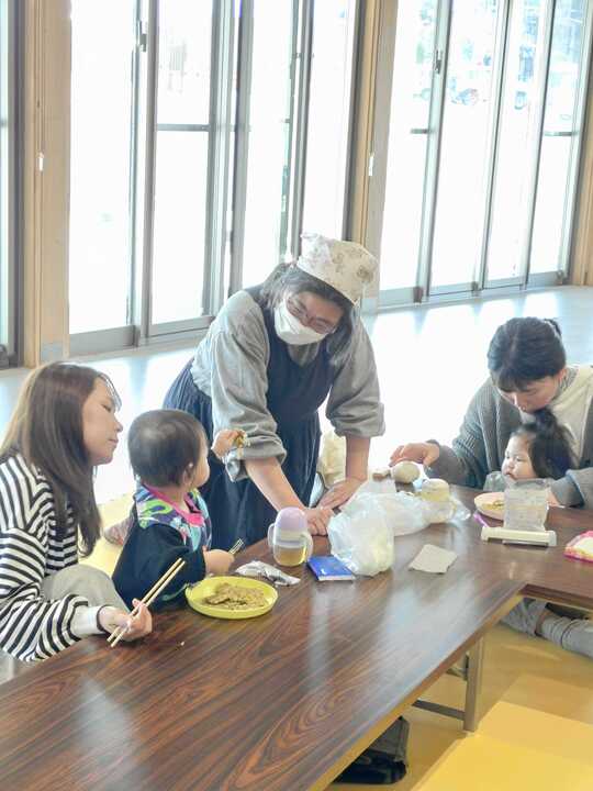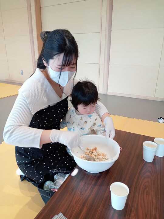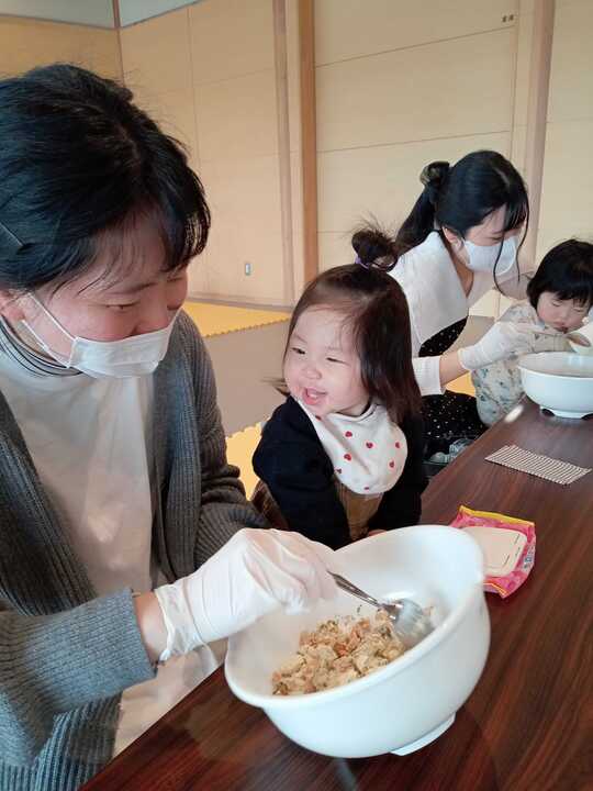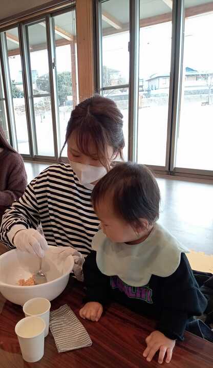 材料を混ぜて、あとは焼くだけの簡単クッキング。ボウルの中を興味深く覗き込むお友だちや、ママの姿をじっと見つめるお友だちの様子も見られました😊